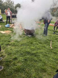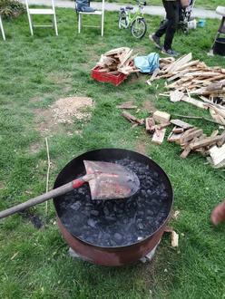 Viel Spaß hatten die Kinder, Holz heran zu tragen und in die große Feuerschale zu werfen. Unter den wachsamen Augen ihrer Eltern warfen sie mit Faszination und Respekt immer wieder Holzstücke in das offene Feuer nach. Bevor die Glut zu Asche zerfallen würde, lösche Sitki Kurhan sie mit Wasser ab. So blieb die Kohlestruktur erhalten, die weiter verwertet werden kann.