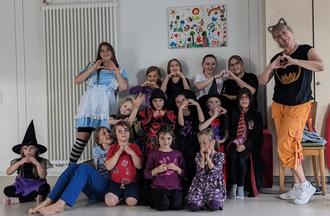 Wer in diesen Wochen am Freitag nachmittags das MGH betritt, erschrickt vor kleinen Hexen, Gespenstern und Fledermäusen. Na klar, die Zumba-Kids sind in Halloween-Laune und das kann sich sehen lassen! Halina Blodget und Anastasia Seeberger haben viel Freude, die Kinder mit mitreißenden Zumba-Rhythmen in Bewegung zu bringen. Im Zumba-Tanz lernen sie Ausdruck, erfahren Selbstwirksamkeit, was ihr Selbstbewusstsein stärkt. Die Gruppe hat sich inzwischen neu zusammen gesetzt, viele Kinder tanzen zum ersten Mal mit. Zwischen Spiel und Tanz mit entsprechenden Lichteffekten genießen sie „gruselige Nachmittage“ im Oktober. Vielen Dank liebe Halina und liebe Anastasia, dass Ihr den Kindern mit so viel Hingabe so viel Spaß bereitet!