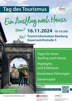 Am Samstag, 16. November 2024, 10 bis 16 Uhr, sind alle Bürgerinnen und Bürger zum „Tag des Tourismus – Ein Ausflug nach Hause“ in die Tourist Information, Geyerswörthstr. 5 in Bamberg, dazu eingeladen, ihre Heimat aus einer neuen Perspektive zu erleben.
