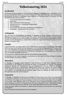 Die Gemeinde Strullendorf gedenkt in einer Feierstunde am Sonntag, 16. November mit dem Gottesdienst um 10.30 Uhr und anschließendem Marsch zum Ehrenmal im Friedhof ihrer Opfer beider Weltkriege. Hierzu sind alle Bürger der Gemeinde, besonders die Angehörigen unserer Gefallenen und Vermissten sowie alle Ortsvereine mit ihren Fahnenabordnungen herzlich eingeladen.