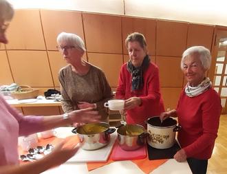Am Tag vorher trafen wir uns wie immer im Pfarrsaal und haben dort gemeinsam Suppe gegessen. Kartoffelsuppe - Karotten und auch Kürbiscremsuppe standen auf unserem Speiseplan. Und sie waren alle lecker. Da macht mir das Kochen doppelt Spaß, wenn es allen so gut schmeckt. Frisches Weißbrot mit oder ohne Körner - passt alles. Ein schön gedeckter und dekorierter Tisch gehören natürlich auch dazu.