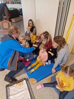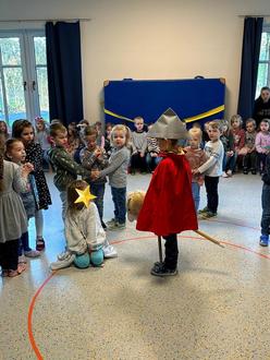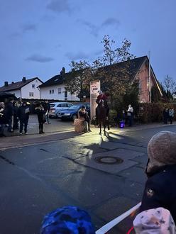 An unserem Martinstag besucht uns am Morgen unser Bürgermeister Herr Desel. Wir spielen ihm ein Martinsspiel vor und singen dabei ein Martinslied. Er hat für uns alle Martinsbrezeln dabei und teilt diese für alle aus. Am Abend ging es weiter bei uns im Kindergarten! Es wird ein Martinsspiel aufgeführt und wir treffen uns mit unseren Laternen. Unser St. Martin führt auf seinem Pferd den Zug an und wir singen unsere Lieder. Danach treffen wir uns im Kindergarten und es gab etwas zu essen und trinken. Trotz des schlechten Wetters war die Stimmung super!