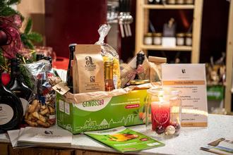 Das beliebte „Weihnachts-Schlemmerkistla“, gefüllt mit leckeren regionalen Spezialitäten ist ab sofort am Stand der Genusslandschaft Bamberg auf dem Bamberger Weihnachtsmarkt erhältlich. Zur Eröffnung der Weihnachtssaison auf dem Maxplatz haben Landrat Johann Kalb und Oberbürgermeister Andreas Starke es sich nicht nehmen lassen und die neue Edition des „Bamberger Weihnachtskistlas“ am Stand der Regionalkampagne vorgestellt. Neben dem Weihnachtskistla werden zudem auch weitere regionale Produkte und Glühwein am Stand angeboten, in diesem Jahr betreut von der Bürgerspitalstiftung sowie der Edelobstbrennerei Schilling.