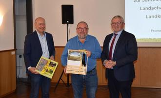 Vorsitzender Michael Karmann und die neue Geschäftsführerin Julia Eberl überreichen Klaus Weber ein Fotoalbum zur Erinnerung an seine langjährige Tätigkeit beim Landschaftspflegeverband.