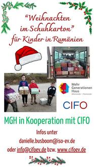 Weihnachtspäckchen sammelt das MGH in der Zeit vom 5.12. bis 17.12. (bitte aus Platzgründen NUR in dieser Zeit abgeben!!!) oder sonst selbst zur CIFO Sammelstelle fahren, jeweils dienstags von 9:00 – 18:00 Uhr, 96114 Köttmannsdorf (bei Hirschaid), Hauptstraße 92. Nähere Infos unter: info@cifoev.de oder www.cifoev.de