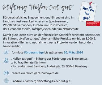 Damit gute Ideen nicht an der finanziellen Starthilfe scheitern, unterstützt die Stiftung „Helfen tut gut“ ehrenamtliche Projekte mit bis zu 3.000 Euro. Innovative Hilfen von Bürgern für Bürger und nachahmenswerte Projekte werden besonders berücksichtigt. Förderanträge können bis spätestens 23. März 2026 formlos gestellt werden an: