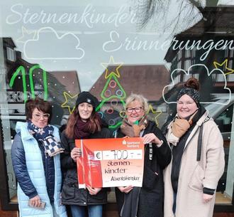 In diesem Jahr waren bereits Mitte November alle Adventsfenster vergeben. Einige Bürgerinnen und Bürger boten vor ihrem „Adventsfenster“ für einen guten Zweck etwas zu Trinken und zu Essen an, so auch Familie Ostmann, Bergmann und Biesenecker. Sie haben am 1. Advent durch Ihr Angebot an Leberkäse, Würstchen, Chili con Carne und Glühwein eine Summe von insgesamt 700 € eingesammelt, welche sie Tanja Bergmann, der Leiterin der ehrenamtlichen Gruppe „Sternenkinder Erinnerungen“ mit großer Freude überreichten.