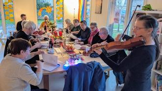 Auch am Nikolaustag traf sich die Mediensprechstunde (regulär alle 14 Tage) und dieses Mal ging es nicht nur um das Erklären, Zeigen und Vertiefen der Kenntnisse auf dem Smartphone und um einen leckeren Cappuccino, sondern auch um das Singen in weihnachtlicher Atmosphäre mit Glühwein, Punsch und Gebäck. Herzlichen Dank an die engagierten Kursleiter: Peter, Andreas und Marcel und an Maria für ihre liebevolle Kaffee-Zubereitung im Jahr 2024.