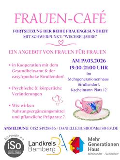 | 19.03.2026 | „Frauen-Café“ zur Frauengesundheit, mit dem Gesundheitsamt & der easyApotheke Strullendorf (19:00 - 21:00 Uhr), Anmeldung erforderlich! |