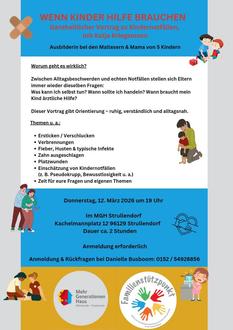 | 12.03.2026 | Erste Hilfe am Kind, Katja Kriegsmann, mit Anmeldung! (19:00 - 21:00 Uhr) |