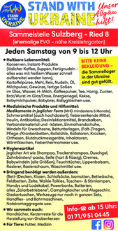 Wir „STAND WITH UKRAINE | Das Allgäu hilft!“ als rein private Hilfsorganisation versichern Ihnen, dass alle Sach- und Geldspenden ausschließlich für die vom Krieg betroffenen Menschen absolut sinnvoll und nach direktem Bedarf übergeben werden. Info-Telefon: 0171/9510445 ab 15 Uhr. Wir freuen uns auch sehr über Geldspenden (natürlich auch bar an der Sammelstelle möglich), damit wir Lebensmittel, Verbandsmaterial, Medikamente, Windeln (für Kinder und Erwachsene) und andere dringend benötigte Hilfsgüter ganz gezielt und nach Bedarf zukaufen können und auch den Diesel für die LKWs.