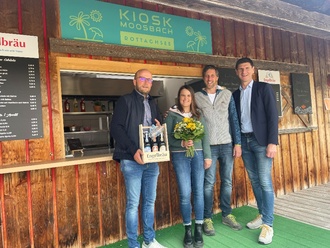Seit April 2023 begrüßen wir am Kiosk Moosbach neue Pächter. Mit der Brauerei „Engelbräu Rettenberg Felix Widenmayer e. K.“ haben wir einen kompetenten Partner mit Gastronomie-Erfahrung gewinnen können. Mit Alexandra Bernegger und Matthias Schwarz hat der Kiosk recht schnell wieder neue Betreiber gefunden. Die beiden freuen sich, Sie ab sofort (bei guter Witterung) zu Getränken und wechselnden Tagesgerichten auf der schönen Sonnenterasse mit bestem Ausblick auf den Rottachsee mit ihrem kulinarischen Angebot verpflegen zu können. Im Zuge des Pächterwechsels wurde auch die Grundausstattung einer Gastroküche durch den Markt Sulzberg neu eingebaut. Die Eröffnung nahm auch Erster Bürgermeister Gerhard Frey zum Anlass, dem neuen Betreiberpaar für den Start alles Gute, ein gutes Geschäft und viele Kunden zu wünschen. Er überreichte hierzu einen Blumenstrauß. Wir danken zudem der Brauerei Engelbräu und freuen uns auf gute Zusammenarbeit.