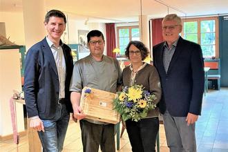 Erster Bürgermeister Gerhard Frey und Roland Bauschmid, Geschäftsführer der Gasthof Hirsch Sulzberg GmbH, gratulierten Hubert und Stephanie Schultes ganz herzlich zum 10-jährigen Jubiläum als Pächter im „Gasthof zum Hirsch“ und überreichten ein Geschenk sowie einen Blumenstrauß.