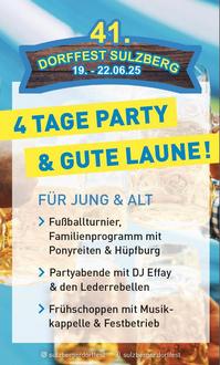 Dann heißt es vom 19. – 22. Juni 2025 wieder: Feiern, Kicken und Spaß haben auf dem Sulzberger Dorffest! Auch dieses Jahr haben wir wieder ein abwechslungsreiches Programm auf die Beine gestellt.