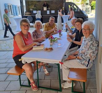 Das Team vom Weinladen Sulzberg hatte das Weinmobil direkt vor unserer Bücherei aufgestellt. Bei feinsten Weinen wurde viel geratscht und gelacht. Die Bücherei hatte den ganzen Abend geöffnet und jeder konnte nach Lust und Laune in unseren Neuheiten schmökern und Bücher ausleihen. Besonders die ausgestellten Leseempfehlungen des Büchereiteams kamen gut bei unseren Leserinnen an.