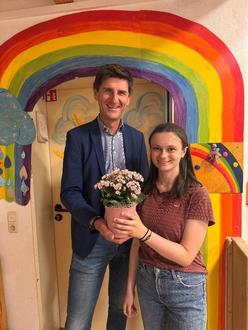 Frau Julia Hall hat zum 1. Juli 2025 im Kindergarten Hildegardis eine Stelle als Erzieherin angetreten. 1. Bürgermeister Gerhard Frey freut sich mit Kindern, Eltern und den Pädagoginnen über die neue Gruppenleitung der Regenbogengruppe.