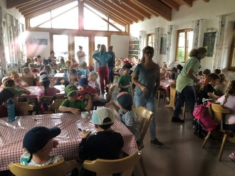 Um mit allen Sinnen zu genießen was im Lehrgarten wächst und gedeiht, gab es als Stärkung nach der anstrengenden Wanderung Wraps mit Salat und Gemüsefüllung. Nicht alle Kinder waren begeistert vom knackig, gesunden Menü, aber spätestens bei Joghurt und frisch gepflückten Beeren waren auch bis dato zögerlichen Esser überzeugt.