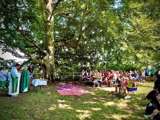 Freudig ging es die Stufen hoch, wo der Familiengottesdienst unter freiem Himmel bzw. den dicken Buchen stattfinden sollte. Alles war schon schön hergerichtet. Schnell wurden noch ein paar Zeilen Text an die Schulkinder und einige Eltern verteilt. Auch ich bekam eine Fürbitte anvertraut. Neben Pfarrer Hermann Drischberger und Diakon Georg Lechleiter, trugen viele zu einem gelungenen Gottesdienst bei. Es wurde wieder fröhlich gesungen und dieses Mal ging es um „Nebensache und Hauptsache“ und sollte uns zeigen, wie wichtig es ist sich Zeit zu nehmen und dem anderen wirklich zuzuhören. Alle Kinder durften kleine Herzen auf ein großes Herz legen, sich in einem großen Kreis „Friede sei mit dir“ wünschen und sich den Segen abholen.