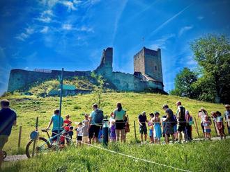 So kam es, dass wir am Sonntag bei schönstem Wetter am alten Sportplatz in Sulzberg gespannt und voller Vorfreude darauf warteten, dass es losgeht. Es kamen immer mehr und mehr junge Familien zum Treffpunkt. Georg Lechleiter hieß als Diakon alle herzlich willkommen und wir stimmten uns fröhlich mit einem Lied auf die Wanderung hoch zur Burgruine ein. Dieses und alle weiteren Lieder wurden schwungvoll auf der Gitarre von Thomas Lechleiter begleitet.