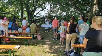 Frisch gestärkt konnte nun der Familiengottesdienst zusammen mit Pfarrer Drischberger und allen anderen Gästen gefeiert werden. Einige Kinder lasen dabei die Kyrie-Rufe und die Fürbitten vor, Diakon Lechleiter hielt eine ansprechende Predigt zum Thema. Musikalisch wurde sowohl die Wanderung als auch der Gottesdienst vom Gitarrenduo Cantica umrahmt.