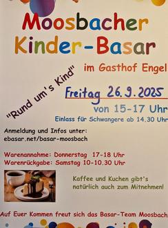 Unser Kinderbasar findet am Freitag, den 26.09.25 von 15:00 bis 17:00 Uhr im Gasthof Engel in Moosbach statt.