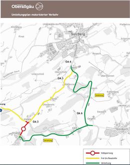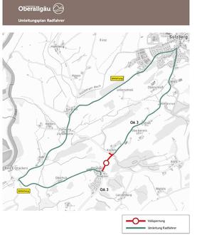 Seit zwei Monaten herrscht nördlich von Ottacker (Gemeindegebiet Markt Sulzberg) entlang der Kreisstraße OA 3 Bautätigkeit. Hier wird ein fahrbahnparalleler Geh- und Radweg zwischen Ottacker und Kenels errichtet, der insbesondere für Alltagsradler einen Mehrwert bringen wird. Langfristig ist auch ein Radweglückenschluss bis nach Sulzberg denkbar. Nun stehen im Bauablauf die Asphaltierungsarbeiten bevor. Da die Fahrbahn der Kreisstraße streckenweise auch davon betroffen ist, muss die Kreisstraße für ein paar Tage vollgesperrt werden. Zwischen dem 04.09., 07.00 Uhr und dem 08.09.2023, 17:00 Uhr wird der motorisierte Verkehr über die Kreisstraßen OA 3 und OA 6, sowie die Gemeindeverbindungsstraße Albis umgeleitet (siehe Umleitungsplan motorisierter Verkehr). Bei nicht geeigneter Wetterlage kann sich die Sperrung unter Umständen entsprechend verschieben. Für Radfahrer wird über Ried bei Ottacker und Burgratz eine Umleitung Richtung Sulzberg eingerichtet (siehe Umleitungsplan Radfahrer). Bis Ende September finden anschließend noch Neben- und Restarbeiten unter halbseitiger Sperrung statt. Grundsätzlich können ab dem 09.09. aber Fußgänger, Radfahrer und Autofahrer die Baustelle passieren.
