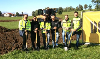 Beim Spatenstich hoben (von links nach rechts) Michael Feneberg (Prokurist der Firma Dobler), Gerhard Kreitmair (Polier der Firma Dobler), Pius Rist (Bauleiter der Firma Dobler), Robert Schwarz (Schwäbisches Ing.-Büro), Tobias Barensteiner (Leiter des technischen Bauamtes des Markt Sulzberg) sowie Sulzbergs Erster Bürgermeister Gerhard Frey symbolisch die Schaufeln an. Frey freut sich: „Nun werden die Planungen und Arbeiten der Vergangenheit sichtbar im Sinne von realen Arbeiten. Unser Ziel für dieses Baugebiet ist, dass wir hier Baugrund für unsere eigene Bevölkerung und junge, einheimischen Familien bereitstellen können.“