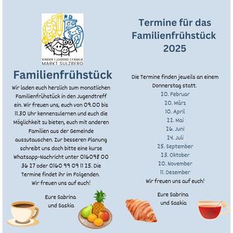 Gerne möchten wir alle frisch gebackenen Eltern zu unserem Familienfrühstück einladen. Dieses findet einmal im Monat von 9 – 11.30 Uhr im Jugendtreff (Rathausplatz 4, Gebäude neben dem Rathaus) mit Saskia und Sabrina von der gemeindlichen Kinder-, Jugend- und Familienarbeit, statt. In gemütlicher Atmosphäre möchten wir euch gerne kennenlernen und euch die Möglichkeit geben euch mit anderen Familien aus der Gemeinde auszutauschen. Um besser planen zu können, schreibt uns doch bitte einen Tag vorher dass ihr kommt – gerne per Whatsapp unter 0160/ 98 00 36 27 oder 0160 99 09 11 25. Bei dieser Gelegenheit möchten wir euch auch gerne den Willkommensgruß der Gemeinde Sulzberg, das Sulzberg Tshirt für euer neues Familienmitglied, überreichen.