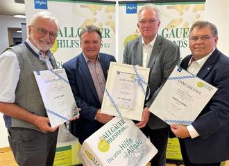 Foto: Angelika Gehring - Stefan Bosse aus Kaufbeuren folgt auf Gebhard Kaiser als Vorsitzender des Allgäuer Hilfsfonds, der für seine 25-järhige Tätigkeit zum Ehrenvorsitzenden ernannt wurde. Ebenfalls seit 25 Jahren dabei sind die beiden Gründungsmitglieder Herbert Seger und Simon Gehring, die ebenfalls geehrt wurden.