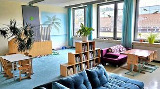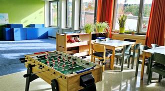 Ein Raum für Ruhe (mit einem gemütlichen Sofa, einem großen Bereich um Lego zu bauen, einem Bücherregal und mehreren Tischen um zu basteln, malen oder zu spielen), ein Raum für Bewegung (mit vielen Baupolstern um Höhlen zu bauen, einer Schultafel zum freien Bemalen, einem Kicker und einem auf die Wand gemaltem Tor um Fußball zu spielen).