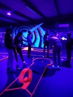 Viel Spaß hatten die acht Jugendlichen im Alter zwischen vierzehn und neunzehn Jahren am Freitag beim Schwarzlicht-Minigolf in der Code Red Arena. Ausgestattet mit 3 D Brillen galt es auf achtzehn beleuchteten Bahnen sein Können unter Beweis zu stellen.