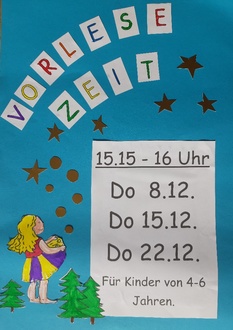 An den drei Donnerstagen 8.12., 15.12. und 22.12. jeweils von 15.15 Uhr bis 16 Uhr ist in der Bücherei „Vorlesezeit“. Es werden zu Winter und Weihnachten passende Bilderbücher und Geschichten für Kinder von 4 bis 6 Jahren vorgelesen. Eine vorherige Anmeldung ist nicht nötig. Die Eltern dürfen in der Zeit gerne für sich in der Bücherei schmökern.
