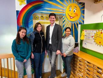 v.l.n.r.: Kamelia Kurteva (Kinderpflegerin), Anja Biardzki (Erzieherin), Erster Bürgermeister Gerhard Frey, Lorstan Schick-Mohamad (Kinderpflegerin)