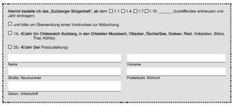 in dieser Woche wird das „Sulzberger Bürgerblatt“ an alle Haushalte im Gemeindegebiet verteilt. Mit dieser Aktion möchten wir unser wöchentliches Informationsblatt und das offizielle Bekanntmachungsblatt des Marktes Sulzberg all denen vorstellen, die das „Sulzberger Bürgerblatt“ bisher noch nicht kennen. In diesem mehrseitigen Druckwerk werden Sie über das Wichtigste in der Gemeinde und aus dem Vereinsleben informiert, Sie erfahren die amtlichen Mitteilungen, Informationen aus den Sitzungen des Marktgemeinderates und anderer Stelle (z.B. andere Behörden, aktuelle Veranstaltungstermine, Neues aus der Gemeindebücherei und dem örtlichen Vereinsleben usw.). Im Bürgerblatt enthalten ist auch der Pfarrbote der Pfarreien Sulzberg, Moosbach und Ottacker sowie der Kirchenanzeiger der Evang.-Luth. Pfarrkirche Kempten/Christuskirche. Ferner informiert die Geschäftswelt über aktuelle Angebote und jeder Bürger hat selbst die Möglichkeit zu inserieren. Das „Sulzberger Bürgerblatt“ wird derzeit in einer Auflagenhöhe von rund 1300 Stück hergestellt und erfreut sich allgemeiner Beliebtheit. Der Bezugspreis beträgt bei Postversand 25,-EUR im Jahr, die Postzustellung ist in diesem Betrag bereits enthalten! Im Ortsbereich Sulzberg und in den Ortsteilen Moosbach, Ottacker, Öschle, See, Graben, Ried, Hofstetten, Bittris, Thal und Köhlis wird das Blatt ausgetragen. Der Bezugspreis einschließlich Zustellung beträgt 14,-EUR im Jahr. Wir würden uns freuen, Sie als neuen Abonnenten begrüßen zu können. Übrigens: Der Bezug kann vierteljährlich widerrufen werden. Sollten Sie am Bezug des „Sulzberger Bürgerblattes“ interessiert sein, genügt ein Anruf bei der Gemeindeverwaltung, Tel. 920115 oder Sie bestellen mit nachstehendem Coupon: