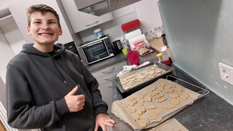 In der Weihnachtsbäckerei … am Freitag, den 6. Dezember wurde fleißig in unserer tollen Küche gebacken und leckerer selbstgemachter Punsch gekocht. Ins Plätzchen ausstechen und verzieren vertieft, überraschten uns die Klausen vom Dorfplatz mit einem kurzen Besuch im Jugendtreff. Mit lautem Glockenklang erkundeten sie den Jugendtreff, manch eine*r flüchtete sich sogar aufs Klo. Die Klausen waren aber total brav und einer machte sogar ein Foto mit denen, die sich trauten