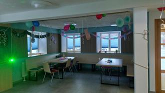 Nach Weihnachten ist vor dem Fasching: Die stimmungsvolle Häuserlandschaft wurde abgehängt und gegen kunterbunte Faschingsdeko ausgetauscht. Wir haben gemeinsam Girlanden bunt bemalt sowie Luftballons und Luftschlangen aufgehängt. Mit speziellen Fenstermalstiften wurden die Fenster fantasievoll verziert. Natürlich werden zur „fünften Jahreszeit“ Faschingslieder