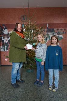 Stellvertretend für alle Klassen der GS Surberg nehmen die Klassensprecherinnen der beiden 4. Klassen die Spende entgegen, die von Frau Neumann, Organisatorin des Surberger Kleidermarktes, überreicht wird.