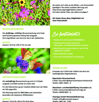 | - | Anmeldung beim Maschinen- und Betriebshilfsring Traunstein e.V. unter mr.traunstein@maschinenringe.de, telefonisch per 08669 8655 – 0 oder online unter Patenschaft Blühflächen & Artenvielfalt (eveeno.com) |