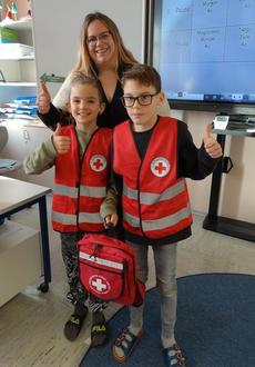 Im letzten Schuljahr wurden unsere Drittklässler zu Juniorhelfern ausgebildet. Nun können sie die gelernten Erste-Hilfe-Maßnahmen in der Schule anwenden. Mit der entsprechenden Ausrüstung, einem Erste-Hilfe-Rucksack und zwei Westen, dürfen die Juniorhelfer auf dem Pausenhof als Ersthelfer tätig werden. Danke an den Förderverein, der sowohl den Erste-Hilfe-Kurs als auch die Ersthelfer-Ausstattung finanziert hat und danke an Frau Sedlmeier, die den Kindern als gelernte Krankenschwester und Rettungssanitäterin, die Ausrüstung übergeben und erklärt hat.