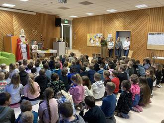 Da er dieses Jahr wieder ohne Begleitung zu uns kam, durfte ein Erstklässler seinen langen Bischofsstab halten. So konnte der heilige Mann sein dickes goldenes Buch öffnen, aus dem er zunächst alle Kinder gemeinsam in Reimform ansprach. Nun folgte viel persönliches Lob an die einzelnen Klassen von der ersten bis zur vierten Jahrgangsstufe, das er mit seiner sonoren Stimme vortrug. Dass im Anschluss noch ein paar mahnende Worte fielen, trübte die Freude der Kinder kaum. So hatten die meisten bereits den Berg an großen Jutesäcken wahrgenommen, die neben der Eingangstreppe auf jede Klasse warteten. Doch etwas Geduld mussten alle Schülerinnen und Schüler noch aufbringen, denn zum Abschluss richtete der Nikolaus noch ein paar wichtige Worte an alle gemeinsam zu den Themen „Ordnung“ und „Lautstärke im Schulhaus“, sowie: „… Mit Frieden und Rücksicht wird´s besser gehen, das müsst ihr wohl alle hier verstehen! ... “. Bevor er ging, erkundigte sich der heilige Mann noch interessiert bei den Kindern, ob sie denn alle Platz hätten in dem schönen neuen Gebäude, das bald fertig sei. Schnell kam die Aufklärung durch Kindermund, dass es sich bei dem Neubau um ein Haus für die Mittagsbetreuung handle. Zum Abschied sangen alle miteinander als Dank für den „himmlischen“ Besuch: „Wir sagen euch an den lieben Advent, …“ und geleiteten damit den Nikolaus klangvoll hinaus.
