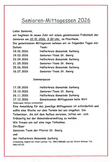 wir beginnen im neuen Jahr mit einem gemeinsamen Frühstück der Senioren am 22.01.2026, 9.00 Uhr, im Pfarrheim. Die gemeinsamen Mittagessen nehmen wir an folgenden Tagen ein: