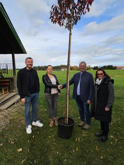 Da wir nun einen Schattenspender weniger hatten, hatte eine Familie der KiTa eine tolle Idee. Familie Schnell, die ihre Tochter bei uns im Kindergarten hat und Herr Fleischmann von Büchele Garten und Wohnkultur GmbH spendeten einen neuen Baum.