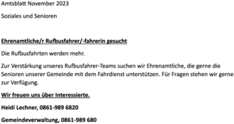 Zur Verstärkung unseres Rufbusfahrer-Teams suchen wir Ehrenamtliche, die gerne die Senioren unserer Gemeinde mit dem Fahrdienst unterstützen. Für Fragen stehen wir gerne zur Verfügung.