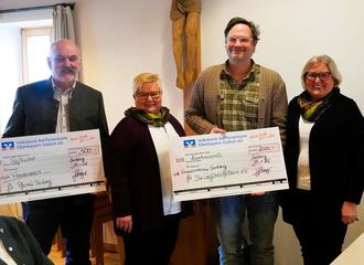 Vorsitzende Kathi Schallinger (Zweite von links) übergab mit ihrer Schatzmeisterin Erika Maier (rechts) Spenden in Höhe von 500 Euro an Pfarrgemeinderatsvorsitzenden Sepp Wimmer (links) und 2000 Euro an Daniel Georg-Stoklossa (Zweiter von rechts) von den „GefühlsHelden“.