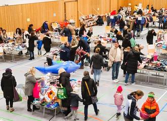 Bereits vor Verkaufsbeginn bildete sich am Halleneingang eine riesige Traube von Familien, die darauf warteten auf Schnäppchenjagd zu gehen. Doch vorerst durften nur werdende Eltern bevorzugt einkaufen. Als die Türen dann endlich auch für alle aufgingen, gab es kein Halten mehr und die Surtalhalle wurde gestürmt. Schnell wurden die Tische merklich leerer und der Kassenbereich immer voller. Trotzdem die Kleidermarktdamen an den drei Kassen mit Hochdruck arbeiteten, mussten sich die Einkäufer zum Bezahlen etwas in Geduld üben. Dennoch herrschte in den Warteschlangen, ob der vielen günstig ergatterten Schnäppchen gute Stimmung.