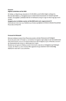 Wir bitten um Beachtung, dass ab dem 01.05.2025 ausschließlich digital vorliegende, Biometrielichtbilder zur Antragstellung von hoheitlichen Dokumenten im Passamt genutzt verden. Die digitaten Lichtbilder können im Rathaus Surberg im Zuge der Beantragung erstellt werden.