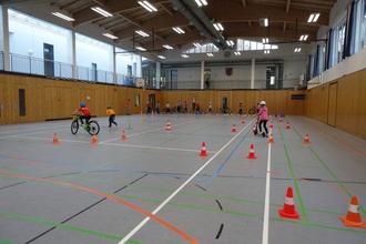 In der Woche vom 20. bis zum 24. März 2023 verwandelte sich die Turnhalle der Grundschule Surberg am Vormittag in einen Fahrrad-Parcours. Zum Aufbau dieses Parcours stellte der ADAC einen Anhänger zur Verfügung, der dafür verschiedene Materialien beinhaltet. An unterschiedlichen Stationen konnten alle Schülerinnen und Schüler abwechselnd wichtige Fahrtechniken einüben. Dazu versorgte die Elternschaft die Schule freundlicherweise mit Fahrrädern in unterschiedlichen Größen und mit Tretrollern. Schnell wurde klar: Das Aufnehmen einer Kette während der Fahrt und das anschließende Ablegen derselben ist gar nicht so leicht. Trotz dieser kleinen Schwierigkeiten haben alle Schülerinnen und Schüler die sportliche Woche gut überstanden und freuen sich schon auf die nächste Möglichkeit, ihr erlerntes Können unter Beweis zu stellen.