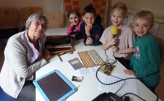 Bei den ersten und zweiten Klassen ging es viel um das Thema „Schule früher“. Sie nahmen Radiobeiträge auf und produzierten Hörspiele. Dafür hatten sie sich etliche Interviewpartner eingeladen, die erzählten wie es früher in der Schule war. Elfriede Münch beispielsweise ging selbst vor über 60 Jahren in Surberg in die Schule. Damals sah das alles aber noch ein bisschen anders aus, auch Schulhefte waren rar. Auch Bürgermeister Michael Wimmer, der die Projektwoche bezuschusste, und Schulleiterin Sabine Ramming antworteten auf Fragen wie: „Was macht man als Bürgermeister?“ und „Warum sind Sie Lehrerin geworden, Frau Ramming?“. Dazu gab es jeweils auch witzige Umfragen unter den Schülern. Was würden die zum Beispiel tun, wenn sie Bürgermeister wären? Oder welches neue Fach wünschen sie sich in der Schule? „Zaubern“ lautete hier eine sehr schöne Antwort. Neben den Radiobeiträgen, die die Kinder auch selbst schneiden mussten, gestalteten andere Gruppen Bild-Collagen, die mithilfe von Sound-Stiften auch Töne von sich gaben.