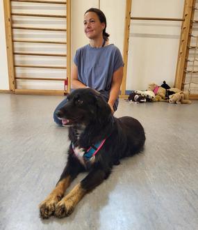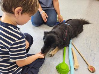 Der Elternbeirat ermöglichte es den vier Gruppen, je einen Workshop zum Thema „Sicherer Umgang mit dem Hund“ zu erleben. Und so besuchte Therapiehündin Luna mit ihrem Frauchen Marlies jede Gruppe, um gemeinsam zu erarbeiten, wie man an der Körpersprache des Hundes seine Stimmung erkennt. Auch Verhaltensregeln wurden mit Hilfe von Bildkarten und Stoffhunden besprochen und ausprobiert. Danach kam für Luna der interessantere Teil – es stand vorsichtiges Streicheln und Leckerlies-Geben auf dem Plan. Dabei konnten die Kinder den Abstand zum Hund mit verschiedenen Hilfsmitteln wie Schaufeln und Rohren selbst bestimmen, und manch einer traute sich sogar schon, Luna aus der Hand zu füttern. Ein tolles Erlebnis, das allen viele Spaß gemacht hat!