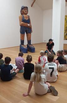 Danach ging es los zur Kunstbegegnung. Die Klasse 4a beschäftigte sich mit dem Künstler Georg Baselitz. Zuerst erkundeten die Schüler die riesengroße Skulptur „Frau Ultramarin“, die der Künstler mit Hilfe einer Motorsäge aus einem großen Holzblock gestaltet hatte. Besonders interessant waren auch die Gemälde von G. Baselitz, da er viele Bilder verkehrtherum malte. Diese Malweise durften die Schüler dann auch selbst ausprobieren und so entstanden viele interessante umgedrehte Köpfe.